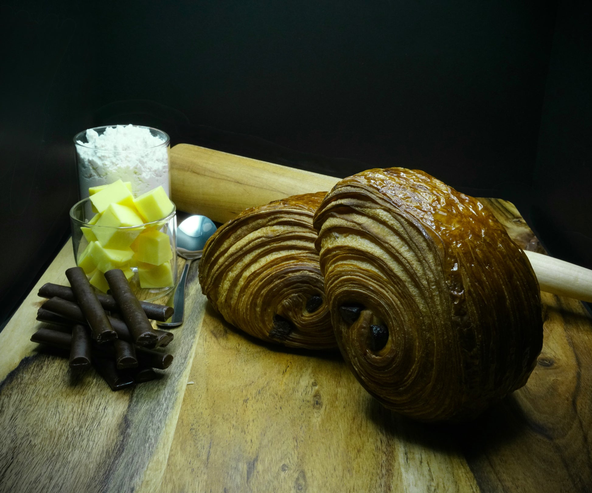 A Light and Flakey 100% New Zealand Butter Chocolate Croissant with Dark Chocolate Batons.