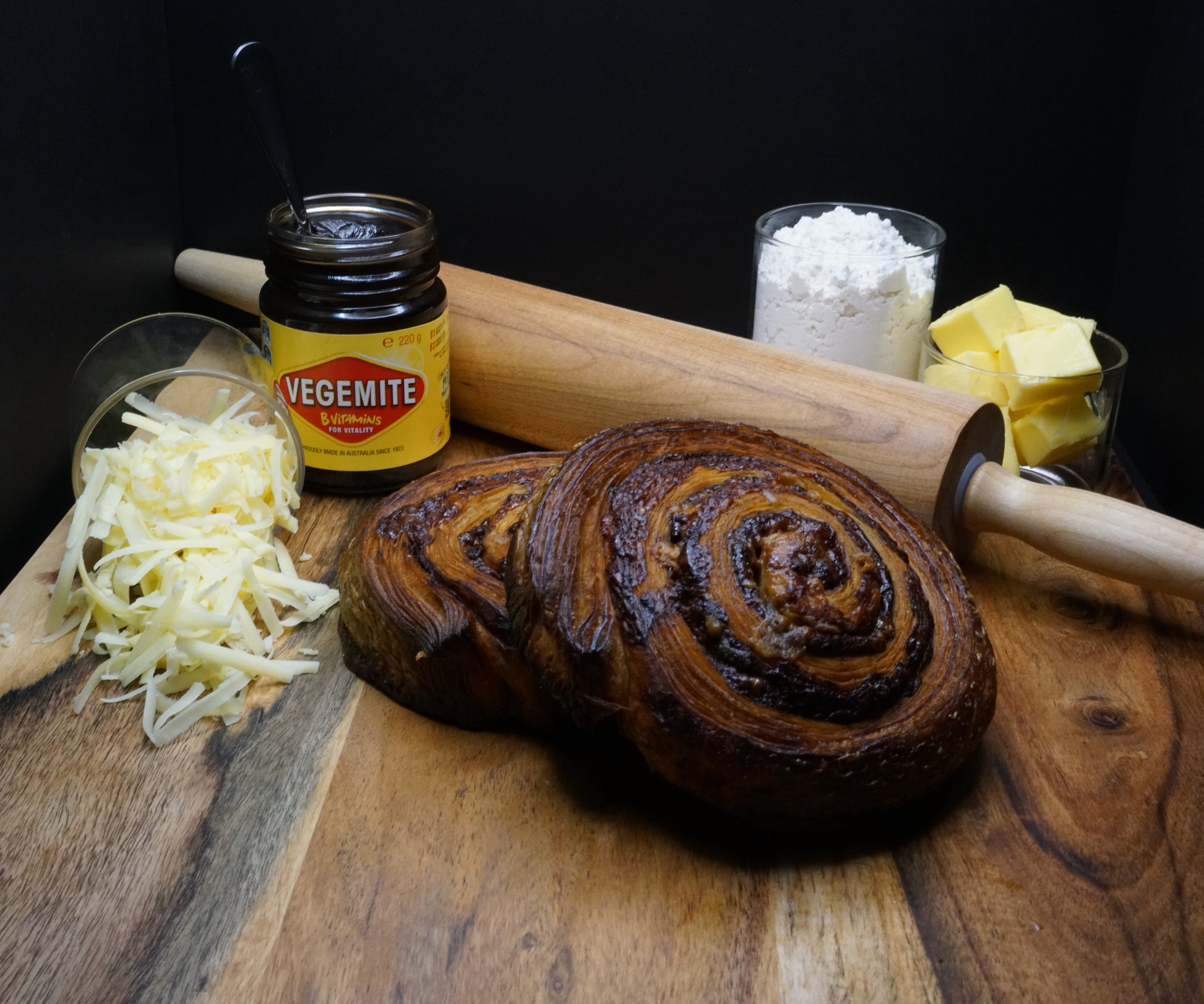 A Light and Flakey 100% New Zealand Butter Vegemite & Cheddar Scroll.