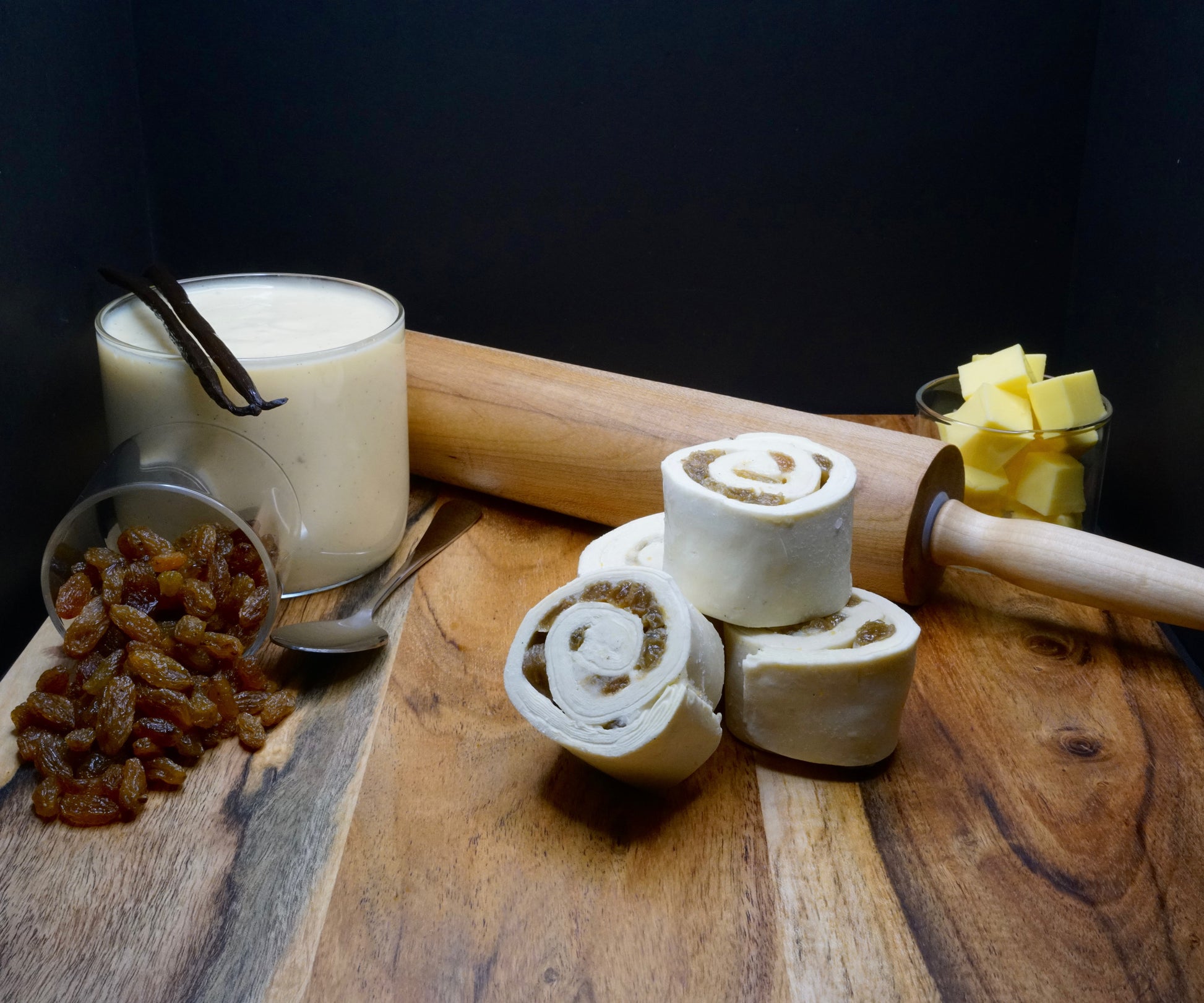 A Light and Flakey 100% New Zealand Butter Mini Pain Au Raisin with a Thick Vanilla Bean Custard and Plump Turkish Raisins.