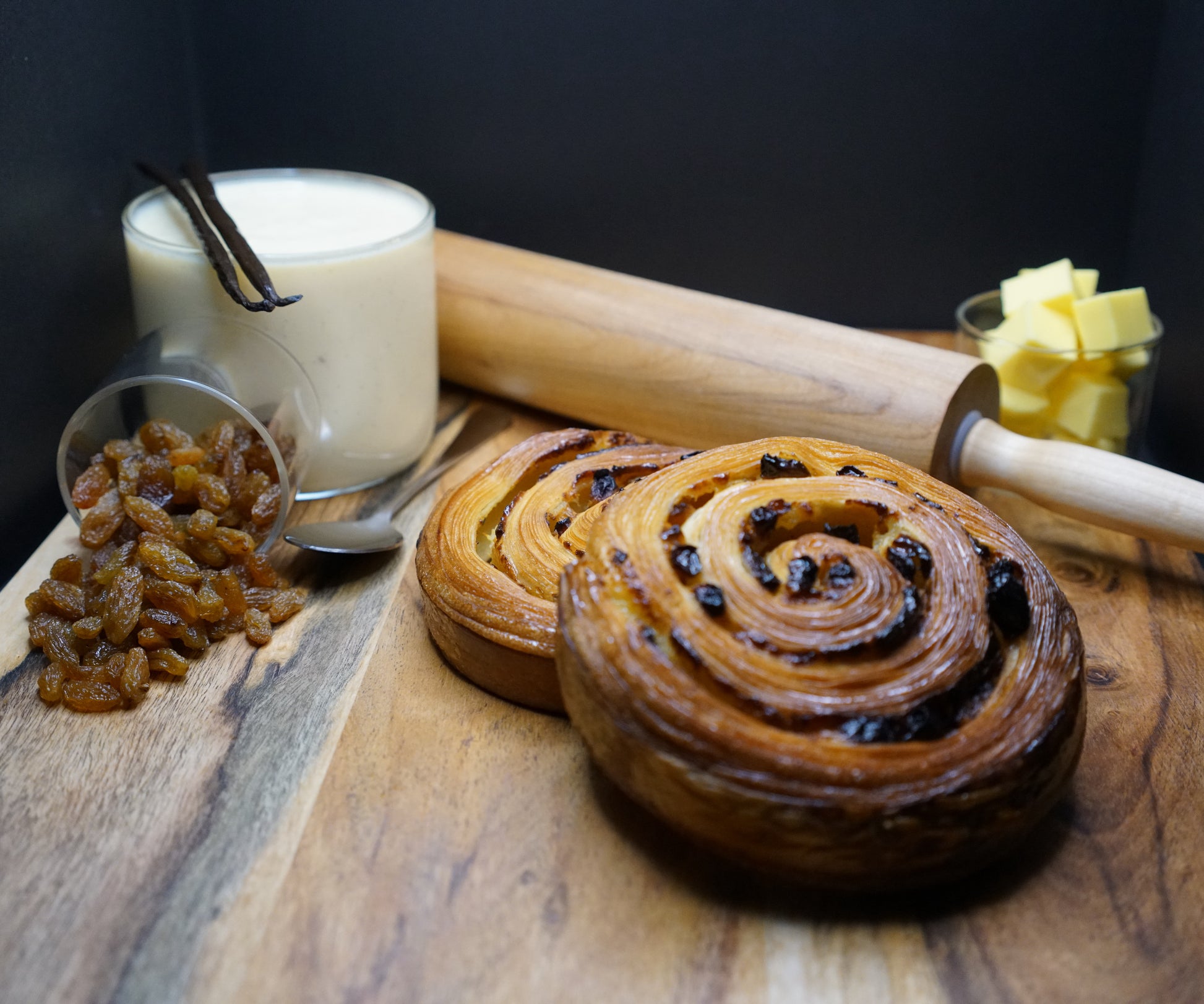 A Light and Flakey 100% New Zealand Butter Pain Au Raisin with a Thick Vanilla Bean Custard and Plump Turkish Raisins.